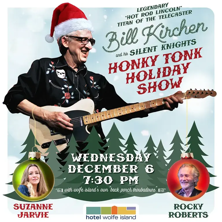 Bill Kirchen and his Silent Knights will make a stop on their annual Honky Tonk Holiday Tour at Hotel Wolfe Island! Featured is a sleigh-full of rarely heard holiday numbers from the blues, rock ‘n’ roll and honky tonk bags: “Silent Surfin’ Night,” “Truckin’ Trees for Christmas,” “Santa Claus Wants Some Lovin,” and more. But be ye not afraid, there’ll be so much more than holiday songs of questionable taste; you can count on a truckload of dieselbilly classics, rockers, and country weepers to take the edge off the holiday fuss. So mark your calendars and check ’em twice — Santa Claus is back in town! Kirchen is touring with his all-star Texas guys — Jack Saunders on bass and Rick Richards on drums.