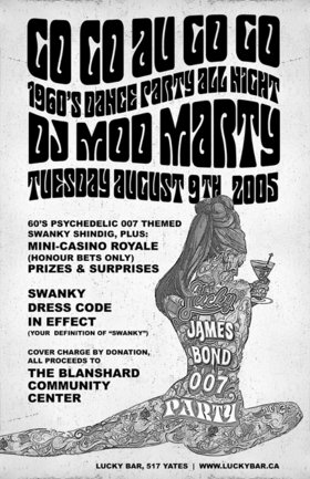 The second istallment of GO-GO a GO-GO is a 60's Psychedelic James Bond Style Swanky Shindig featuring: music, martinis, dancing, and a bit of gambling - all for charity, of course. Music by Mod Marty, A Mini-Casino Royale (Honour Bets Only), Prizes, and Surprises. Swanky dress code in effect (... by your own definition of swank), cover charge by donation. All proceeds to the Blanshard Community Center.