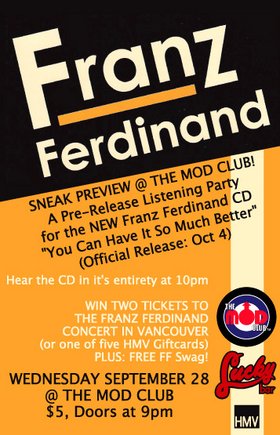 Vic's hippest weekly. A night of everything from 60's Soul, Maximum R&B, Mod Anthems, New Wave, Modern Alt, Indie, Brit, Post Punk, and so much more, with DJs Mod Marty, Skeptic, and Longshanks. (www.themodclub.com) THIS WEEK: a special Pre-Release Party for the NEW Franz Ferdinand CD (...one full week before it's official release). The CD will be played in it's entirety at 10pm, followed by ticket giveaways to the FF show in Vancouver, HMV Giftcard giveaways, and plenty of free swag!