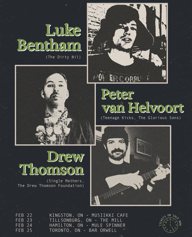 Luke Bentham (The Dirty Nil) Peter Van Helvoort (Teenage Kicks, The Glorious Sons) & Drew Thomson (Single Mothers, The Drew Thomson Foundation) come to Kingston to play songs and tell stories.