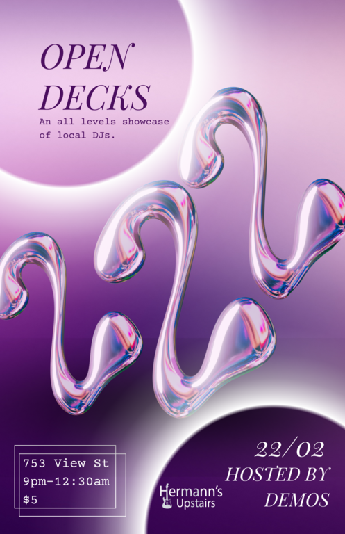 Open decks is a community club night focused around giving local DJ's the space to connect, dance and share music. Join us in celebrating one year of open decks!