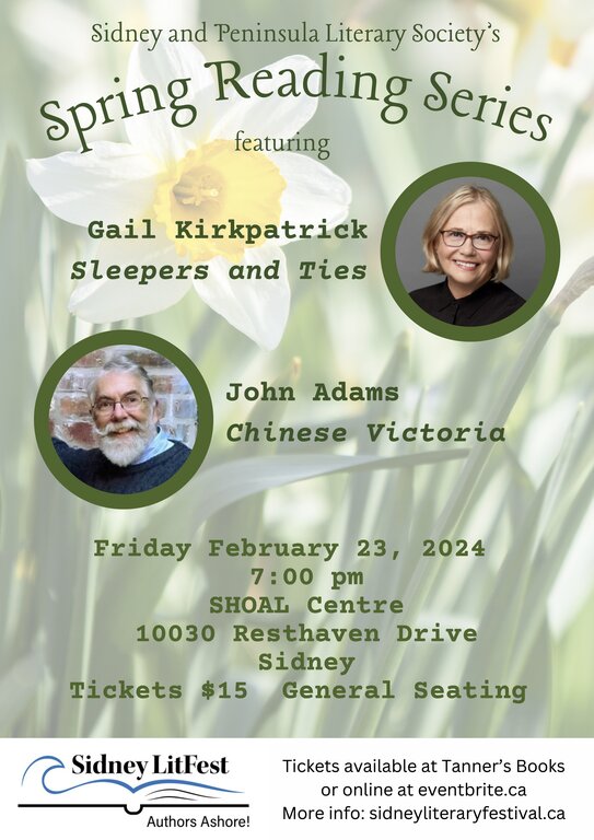 The Sidney and Peninsula Literary Society will host it’s first author reading of 2024 at the SHOAL Centre in Sidney on Friday, February 23 at 7 pm. Authors John Adams and Gail Kirkpatrick will be discussing and reading from their latest books.