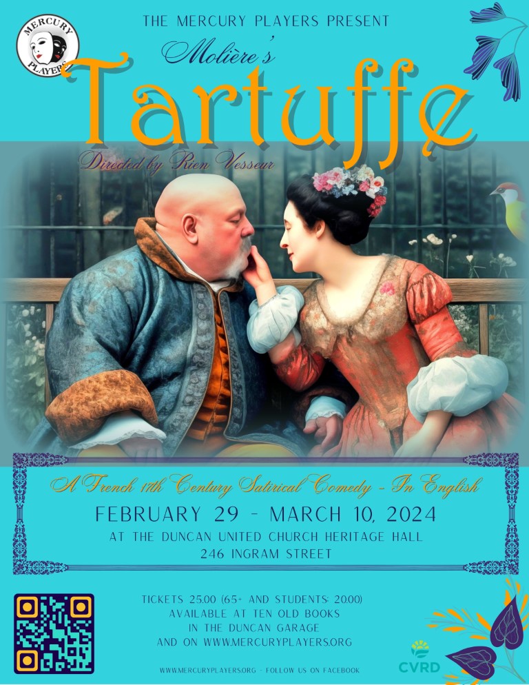A lecherous conman pretends to be a pious spiritual adviser to a wealthy family in Mercury Players Society’s next stage production, Tartuffe, by the great 17th-century French satirist Molière. A delightful farce with plenty of laugh-out-loud moments, and a charming and quirky love story. Written entirely in rhyming couplets, performed by a cast of 12.