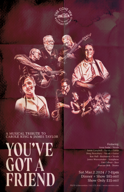 YOU’VE GOT A FRIEND: A Musical Tribute to CAROLE KING and JAMES TAYLOR returns to the Cove Inn on Saturday March 2nd, 2024.