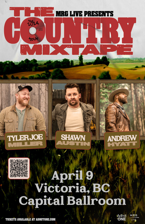 The Country Mixtape Tour is coming to your city in 2024! Featuring Canadian country music hitmakers Tyler Joe Miller, Shawn Austin, and Andrew Hyatt the tour will feature their collective hits mixed in with some of the artists’ favourite cover songs they grew up on. Tyler Joe Miller burst onto the scene in 2020 and has had a string of eight consecutive Top 10 singles, including two #1s with “Pillow Talkin’” and “I Would Be Over Me Too. Miller was nominated for three CCMA Awards in 2023 including Single of the Year for “Wild As Her”. Shawn Austin is hot off his CCMA Award nomination for Album of the Year, and continues to prove he is one of Canada’s fastest rising artists. He also recently celebrated his single “Tailgate to Heaven (feat. Chris Lane)” reaching gold-certification and his latest single “Settle for a Drink” recently hit the Top 10 at Canadian country radio. Andrew Hyatt recently released his acclaimed single “L is For” following his CCMA nomination for Album of the Year in 2023 and his CCMA Award win for Rising Star in 2022. Hyatt brings a string of hits to the tour including the hits “Neverland” and “Do It With You” among others. Together, Miller, Austin and Hyatt are bringing a concert experience to their fans like no other, creating a show you won’t want to miss!