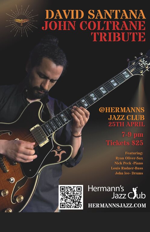 Join us on April 25th for an unforgettable tribute to one of the greatest of all time, John Coltrane, performed by the David Santana Quintet. David Santana will be accompanied by an all-star band featuring Nick Peck on piano, Ryan Oliver on saxophone, Louis Rudner on bass, and John Lee on drums. This is going to be an amazing night full of the magic of Coltrane's music! Get your tickets early!