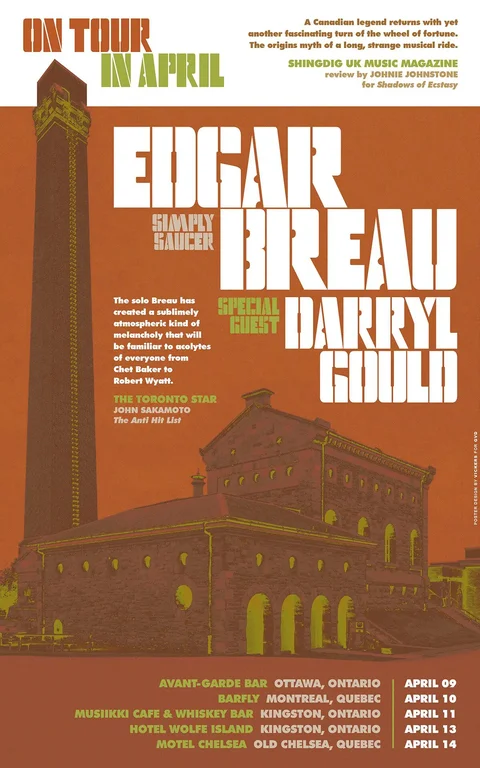If you know Breau’s name, it’s most likely as leader of Hamilton’s cult punk-prog pioneers Simply Saucer, resurrected from the ’70’s and more powerful than ever these days. If you really know Breau, you’ll know his solo work leans to the acoustic folk side, but with lots of grand washes of instruments and dreamy soundscapes. Schooled in folk song traditions, literary fixations, and the fingerstyle guitar playing of John Fahey, his output spans decades, his song writing encompasses haunting acoustic landscapes woven with poetic lyricism, with “short stories with developed characters, marvelous, laid back sound, trippy and rewarding” — Bob Mersereau