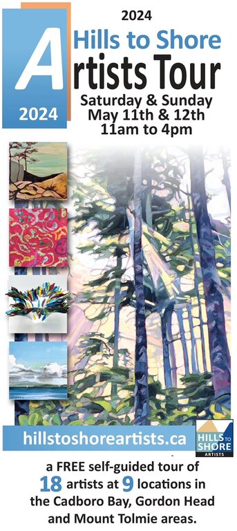 The annual Hills to Shore Artists Tour is Sat. and Sun. May 11th and 12th, 11 am to 4 pm. This free, self-guided tour on Mother’s Day weekend features 18 artists and 9 studios in Gordon Head, Mt. Tolmie and Cadboro Bay. For a map visit the website at https://www.hillstoshoreartists.ca/ or follow us on social media.