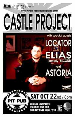 Saturday, Oct 22nd IMU & CiTR present White Whale Recording Artist Castle Project, Locator, Elias (formerly Second) + Astoria @ UBC PIT PUB, 6138 SUB Boulevard, (UBC SUB Lower Level) . 8pm / $10 -:- Info: 604 822 6511