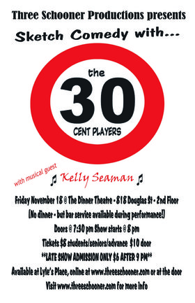 The 30 Cent Players perform their brand of live and filmed sketch comedy for your enjoyment! Kick back, have a few wobbly-pops and enjoy the comedy stylings for only $8.00 (advance/students/seniors) or $10 at the door! Plus, if you can only catch the second half of the show (after 9 pm)...that'll cost you only $6.00! (only available at the door during intermission). Special musical guests - K.J. Bird! So come down to The Dinner Theatre (SECOND FLOOR- 818 Douglas St, Victoria, BC - above The Noodle Box!) and catch the antics of The 30 Cent Players!