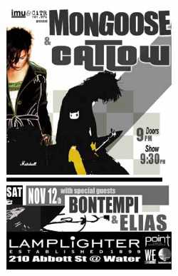 Saturday, Nov 12thIMU & CiTR present Mongoose, Catlow, Bontempi & Elias @ The LAMPLIGHTER, 210 Abbott Street . Doors 9pm / $10 cover