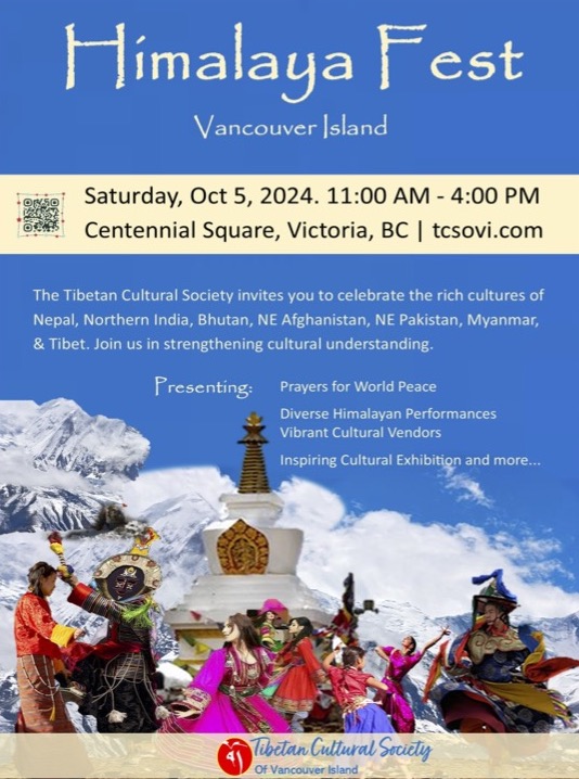 The Tibetan Cultural Society of Vancouver Island invites you to celebrate the cultures of Nepal, Tibet, Northern India, Bhutan, NE Afghanistan, NE Pakistan, and Myanmar on Saturday, October 5. Join us in strengthening Vancouver Island's cultural understanding and awareness of this incredible region.