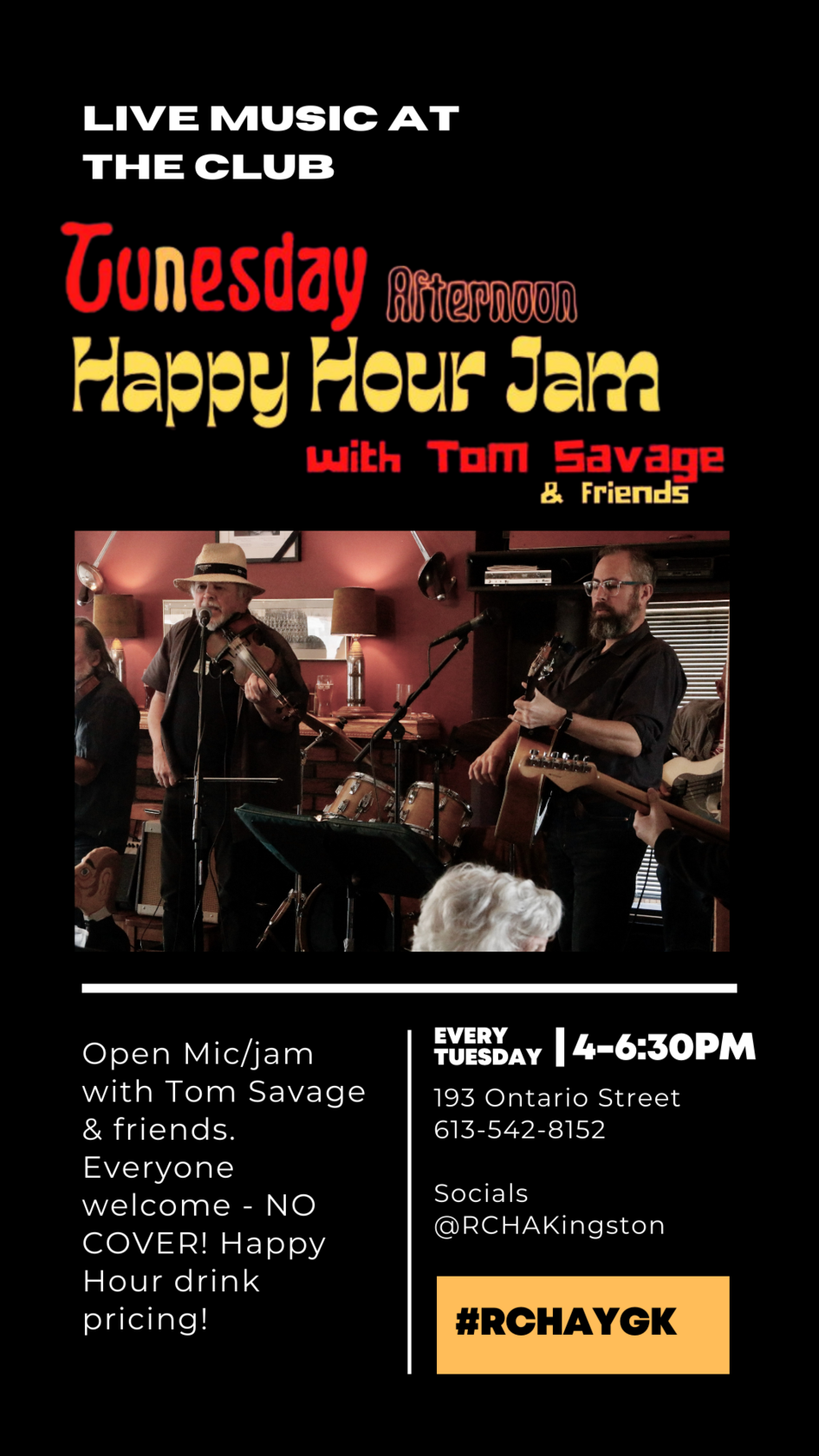 Open Mic/jam with Tom Savage & friends. Everyone welcome! Come early and join the fun! You never know which talented Kingston musicians will be at the jam. Tunesday! This thing is cooking!! 'It feels like a Saturday evening...but it's a Tuesday afternoon!' - Peter Copp - NO COVER! Happy Hour drink pricing and pizza available
