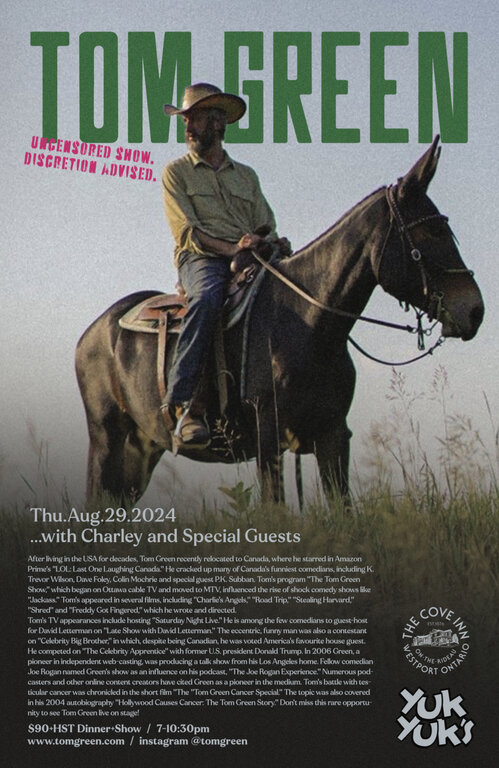 Join us for another very, very special live event at The Cove on Thursday, August 29th, 2024 from 7:00-10:30pm pm for Hollywood Actor/Comedian Tom Green. $90 + HST gets you dinner and the show.