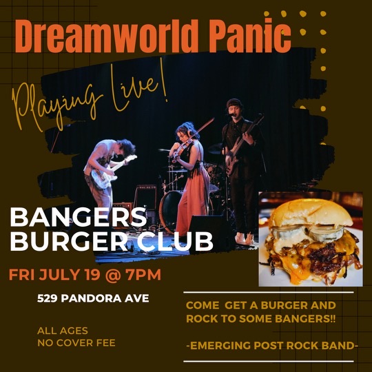 Dreamworld Panic are playing at Bangers Burger Club, home of the garden city's finest smash burger! No cover!