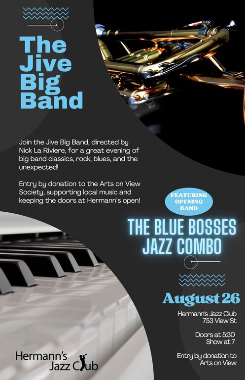 Join us for a fabulous night of big band music. We’ll play some classic swing tunes, some fun and funky grooves, and some unexpected and very fun vocal numbers featuring 3 awesome singers! The Jive Big Band is directed by trombonist Nick La Riviere, and it’s a guaranteed fun night of music. Joining them are The Blue Bosses jazz combo, directed by the amazing Ashley Wey. Entry is by donation to Arts On View, the organization that keeps Hermann’s thriving, so come on out and support Victoria’s best music venue while enjoying a fun night of great music.