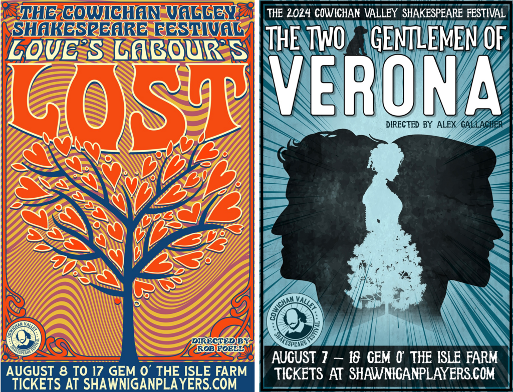 "Love’s Labour’s Lost" runs Aug. 8, 9, 13, 15, and 17 at 7:30pm, with a Sunday matinee at 2:00pm Aug. 11. "The Two Gentlemen of Verona" runs Aug. 7, 10, 12, 14, and 16 at 7:30pm, and Aug. 18 at 2:00pm. Single tickets are $25, or upgrade to a Festival Pass and see both plays for $40. Family passes (children plus an adult or two, up to 5 people) are $50 / $80. Tickets are available at Ten Old Books or online at shawniganplayers.com.