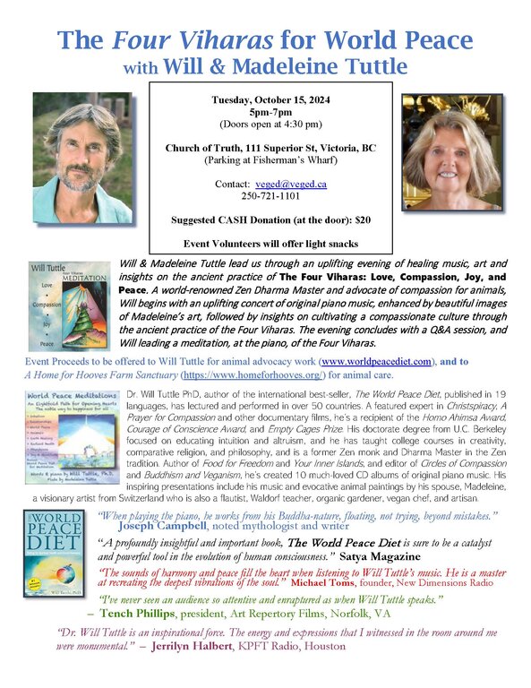 Will & Madeleine Tuttle lead us through an uplifting evening of healing music, art and insights on the ancient practice of The Four Viharas: Love, Compassion, Joy, and Peace. A world-renowned Zen Dharma Master and advocate of compassion for animals, Will begins with an uplifting concert of original piano music, enhanced by beautiful images of Madeleine’s art, followed by insights on cultivating a compassionate culture through the ancient practice of the Four Viharas. The evening concludes with a Q&A session, and Will leading a meditation, at the piano, of the Four Viharas. Part of the Proceeds to support "A Home for Hooves Farm Sanctuary". Info: http://www.veged.ca/Events/Events.html