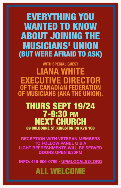 Members and non-members alike are invite to attend this information session about the AFM/CFM and our Local 518, Union of Professional Musicians, serving Eastern Ontario.