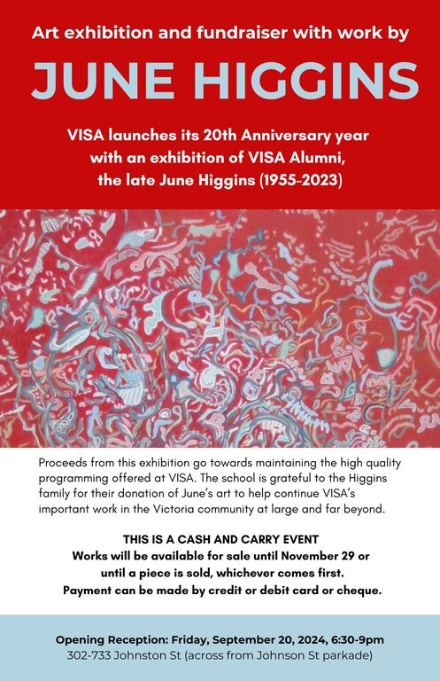 The Vancouver Island School of Art is launching the celebration of its 20th Anniversary year with the Exhibition and Sale of paintings by VISA Alumni June Higgins. June unexpectedly passed away in 2023 after being diagnosed with brain cancer 2022. VISA is honoured to exhibit her work and are grateful to the Higgin's family for the donation to the work to the school. All proceeds from the sale of work will go towards programming at VISA.
