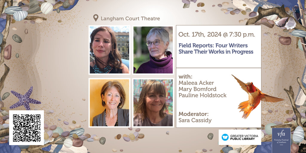 How do writers decide where to commit their attention and time? Are they dazzled, lured, ensnared by a subject, or is the drive from within -- a need to plumb, resolve, re-make. And how do they choose the approach – poetry, fiction, essay, hybrid – or does the form choose them? For this event, multi-genre writers and last year’s Victoria Book Prize finalists Maleea Acker, Mary Bomford, and Pauline Holdstock check in from the field. They will read from their works in progress and discuss why these works, now; the discoveries and the muck; and how the work is changing how they write and how they experience the world.