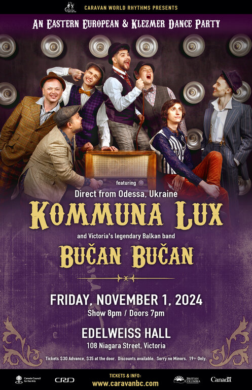 Join us for an uplifting evening of Klezmer music from Odessa, Ukraine with Kommuna Lux (on tour in support of Ukraine), and Victoria’s Balkan Dance Party legends, Bučan Bučan!