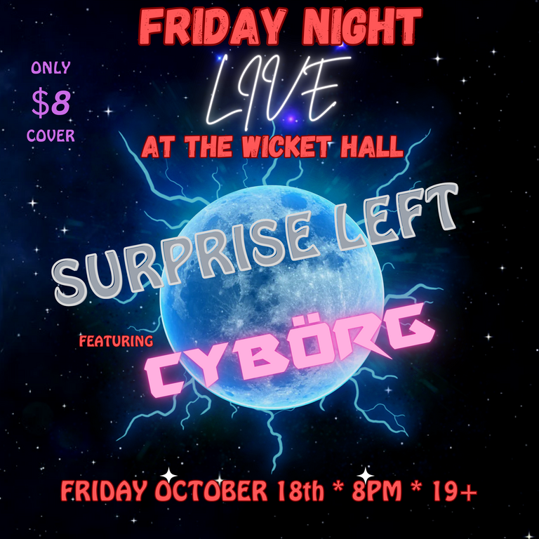 Have a drink and ROCK OUT with two of Victoria's finest! Cybörg will get the show and yer blood pumping with originals and a few select covers. Surprise Left will finish the night with a set of the finest tunes from the 90's and 2000's!!!