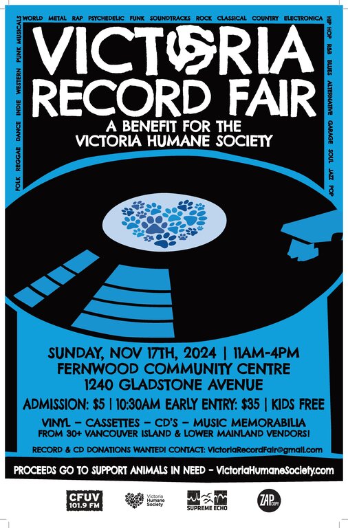 A biannual fundraising event for local charities, this VRF will be raising money to support the Victoria Humane Society. The VHS is a great, local non-profit organization committed to rescuing and finding homes for dogs, cat and other animals in need. (Visit VictoriaHumaneSociety.com for more information.) All the money raised through rentals of vendor tables, admission donations made at the door, and the sales of donated records and CDs will be donated to the VHS.