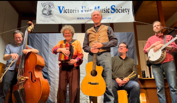 When COVID kicked live music outside, James Anstey (banjo) and Mark Johnson (bass) started jamming on their Vic West backyard boulevard. Neighbours Susan Ellenton and Robert Anderson soon jumped the fence, bringing along their accordion, guitar, bouzouki, and upbeat original songs and a band was born! Newest member, Blair Mitchell (hand percussion) brings a fresh kick to the group whose members have headlined the Calgary Folk Festival, won several songwriting contests, and toured festivals from Alaska to Mariposa to Newfoundland. You can expect shanty-like participation songs, stunning a capella tunes, ballads about local events like the short-lived gold rush in Sooke, and beautiful songs based on local nature. That and so much more! Thoughtful lyrics, exciting band arrangements, and singing-your-heart-out choruses — could we ask for anything better?