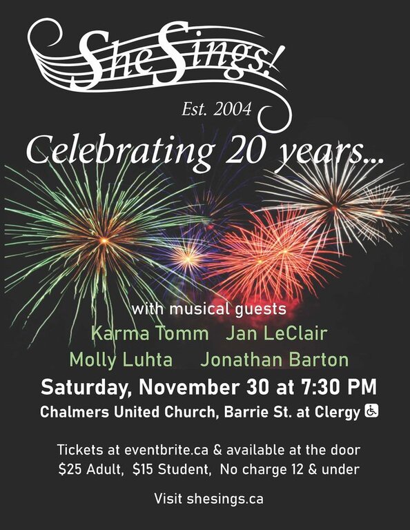 On Saturday, November 30, 2024, She Sings! Women’s Choir celebrates 20 years of music-making with a concert featuring violinist Karma Tomm, accordionist Jan LeClair, soprano Molly Luhta, and drummer Jonathan Barton as special guests. The Celtic-themed evening will include many of the choir’s favourites, as well as exciting new works, and will showcase the usual flare and talents of co-conductor Emily McPherson and pianist Kristin Rae. Two choral works by composer and artistic director Martha Hill Duncan will be presented, and the second half will move us towards the holiday season. We’d love to have you attend this memorable and joyous concert!