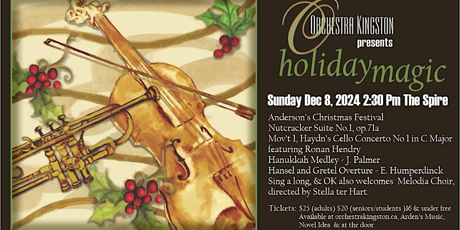Join us as we ring in the Holiday Season with a concert that features seasonal music for orchestra and chorus performed by Kingston's own Melodia Choir, under the direction of Stell ter Hart, and Orchestra Kingston under the baton of John Palmer. Our special guest and the winner of our first concerto competition for young musicians, cellist Ronan Hendry, will perform the first movement of Haydn's Cello Concerto No.1. This is sure to be a concert that touches all the joy and wonder of the season. Be there!