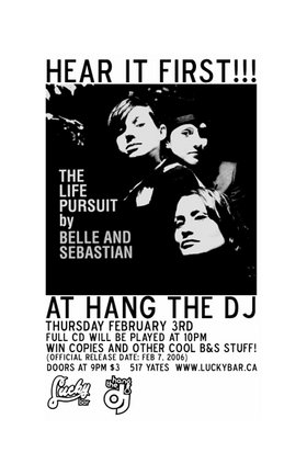 Be the first to hear (and maybe win) the brand new Belle and Sebastian CD "The Life Pursuit", which will be played in it's entirety at 10pm. Plus - cool B&S prizes, and DJs Longshanks and Superbendythumbs spinning their patented party mix. ($3 cover, $3 drinks).