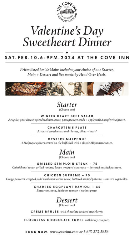 Bring your loved one to The Cove Inn on Friday February 14th, 2025 and celebrate with dinner and live music during our “Valentine’s Table d’Hôte Dinner.” From 6-9pm, we’ll have a fixed special menu and music from our “romantic acoustic duo” Head over Heels!