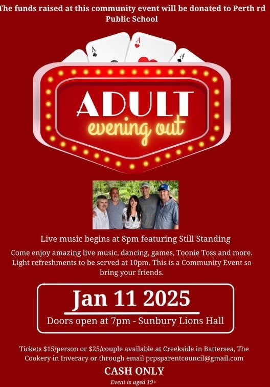 Enjoy live music, dancing and games, Toonie Toss and more. Light refreshments served at 10 pm.