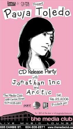Sat, Feb 25th IMU & CiTR present Paula Toledo CD Release Party with Jonathan Inc. & Arctic @ The MEDIA CLUB, 695 Cambie . 9pm / $10 / Pay for your advance admission tickets online now at http://www.imuproductions.com/ticket.html -:- Info: 604 608 2871