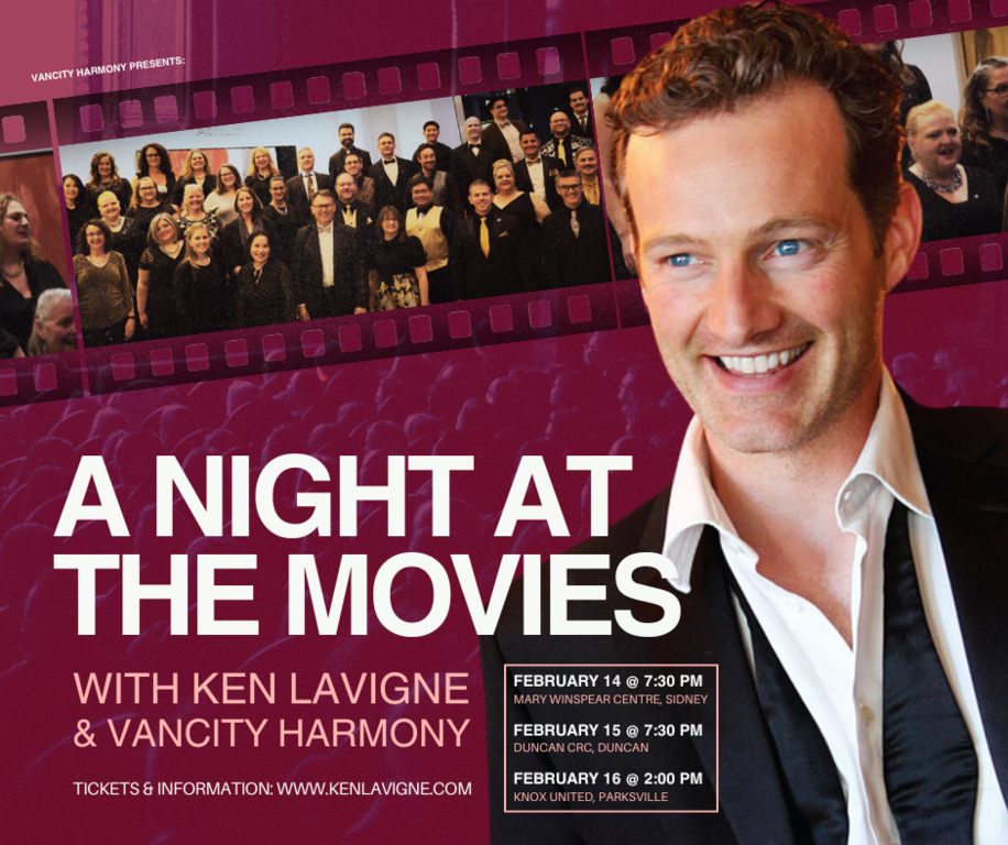Step into the magic of the silver screen with A Night at the Movies, a breathtaking musical journey celebrating the greatest hits of your favourite films. Performed by Ken Lavigne, and the award-winning voices of VanCity Harmony, this evening promises to transport you through the soundtracks that have defined generations.