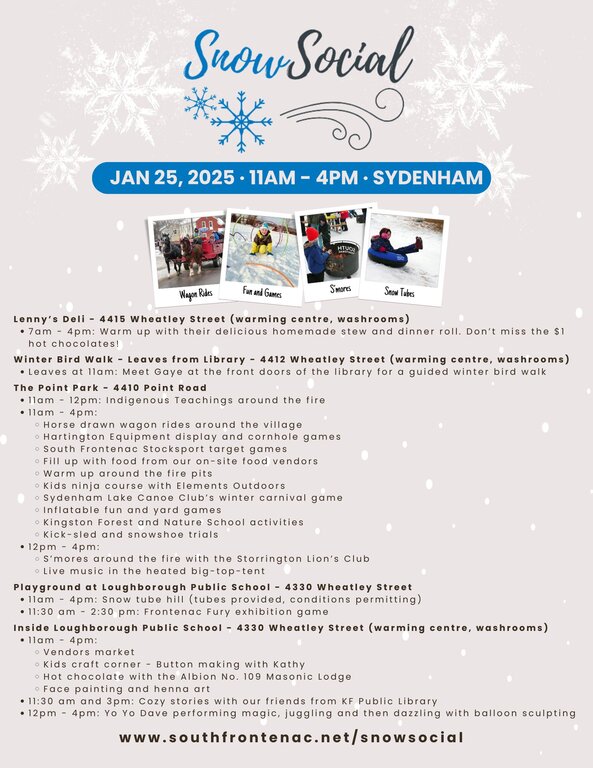 Join us for the third Snow Social! This event is a celebration of the winter season and will feature activities at The Point Park and throughout the village of Sydenham, just 20 minutes north of Kingston. Admission is free however donations will be gratefully accepted. This is an all-weather event. Visitors should dress like a well-prepared Canadian and plan to take part in all sorts of winter fun including snow tubing (conditions permitting) and firepits. We will have a vendor’s market, lots of live music, kids activities, and SNOW much more!
