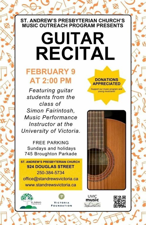 Featuring guitar students from the class of Simon Fairintosh, Music Performance Instructor at the University of Victoria. Donations are appreciated and support both St. Andrew's Presbyterian Church's music outreach program and young emerging musicians!