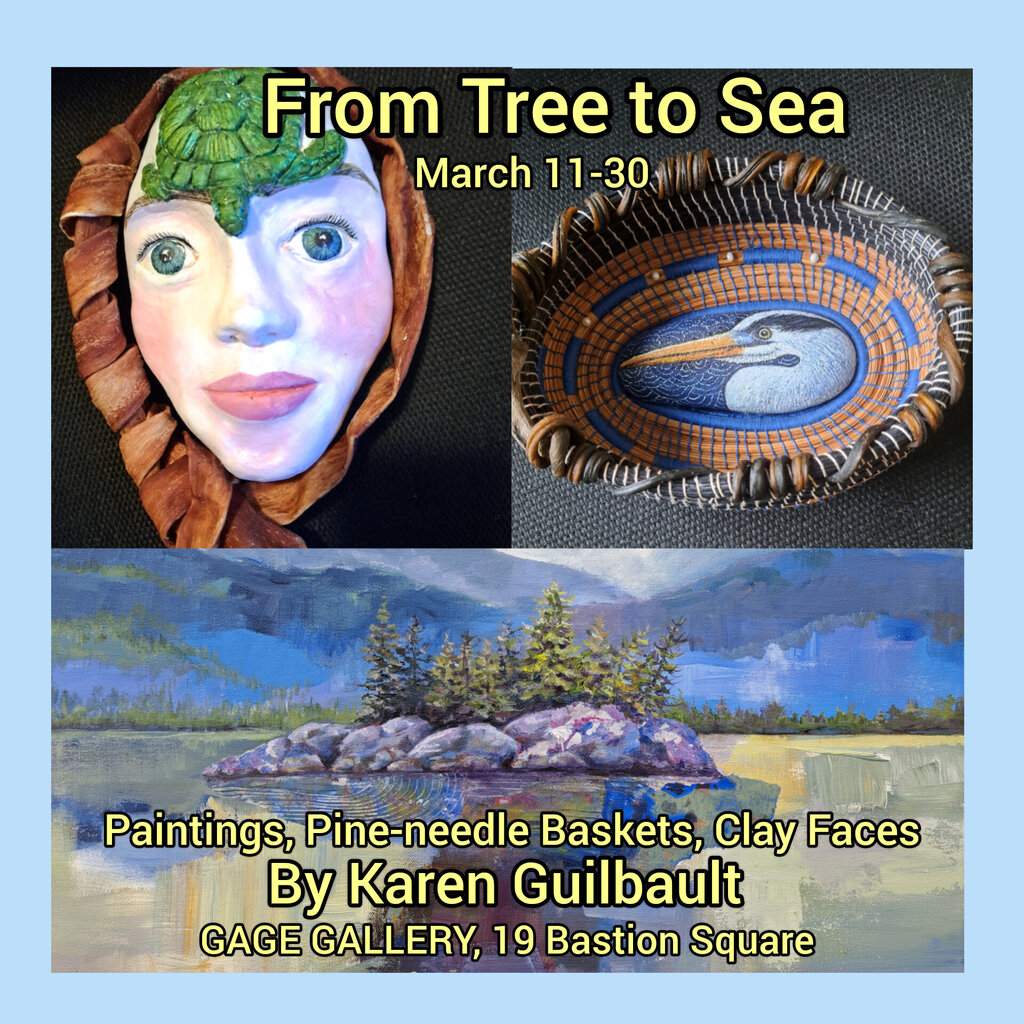 From Tree to Sea is a mixed media art show by Karen Guilbault at Gage Gallery, 19 Bastion Square. See seascape paintings, decorated clay faces, and pine-needle baskets.
