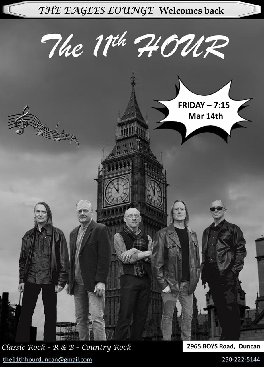 The Duncan Eagles welcomes back "The 11th HOUR". The Lounge features one of the largest dance floors in the Cowichan Valley. Non- members are welcome and can be signed in.