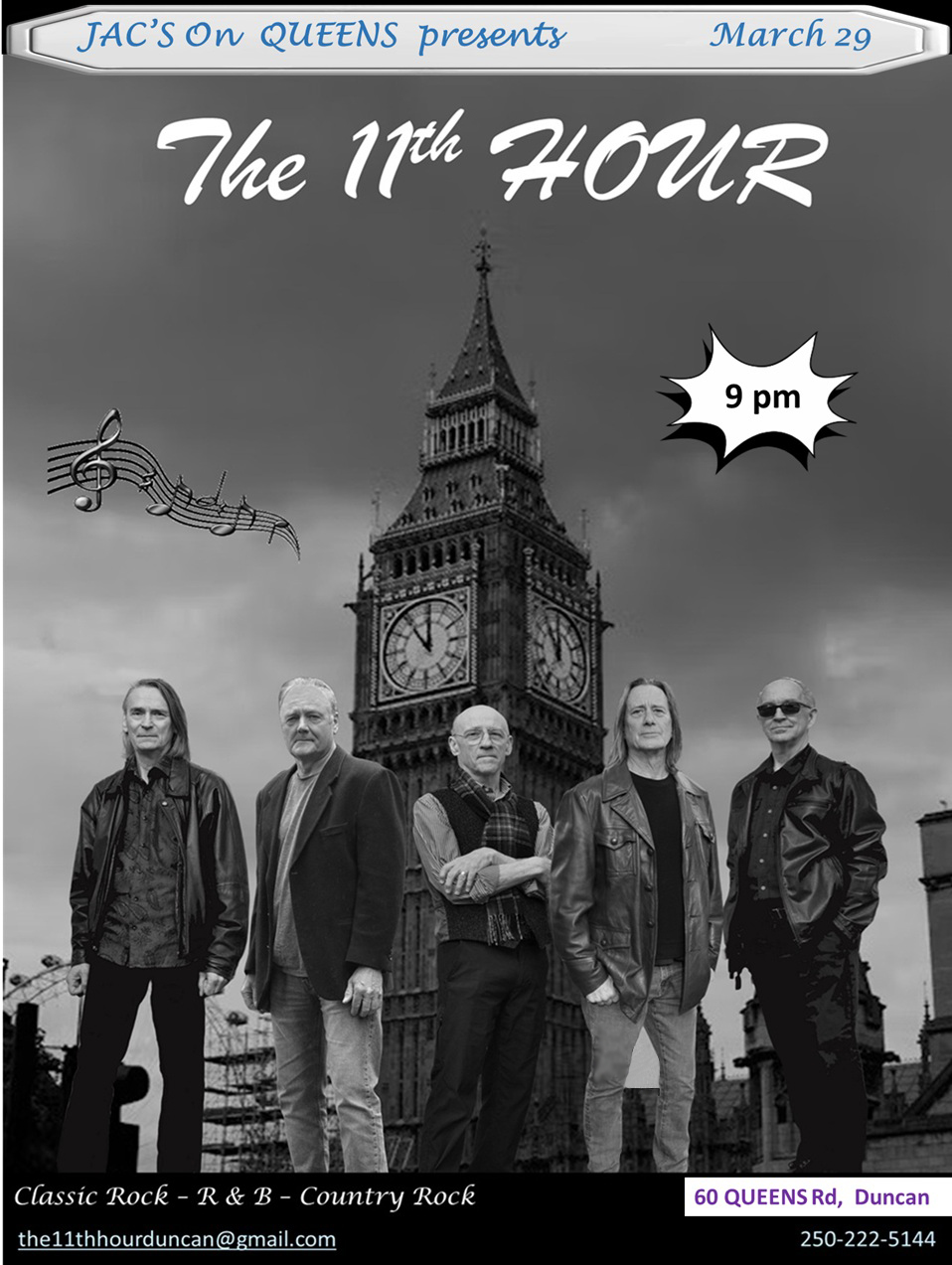 The 11th HOUR performs a selection of Classic Rock, R&B and Country Rock that will have you dancing till you drop. Having (4) lead vocalists, the band tackles complex harmony songs by groups such as; The Eagles, Jackson Browne, Gin Blossoms and The Traveling Wilburys.
