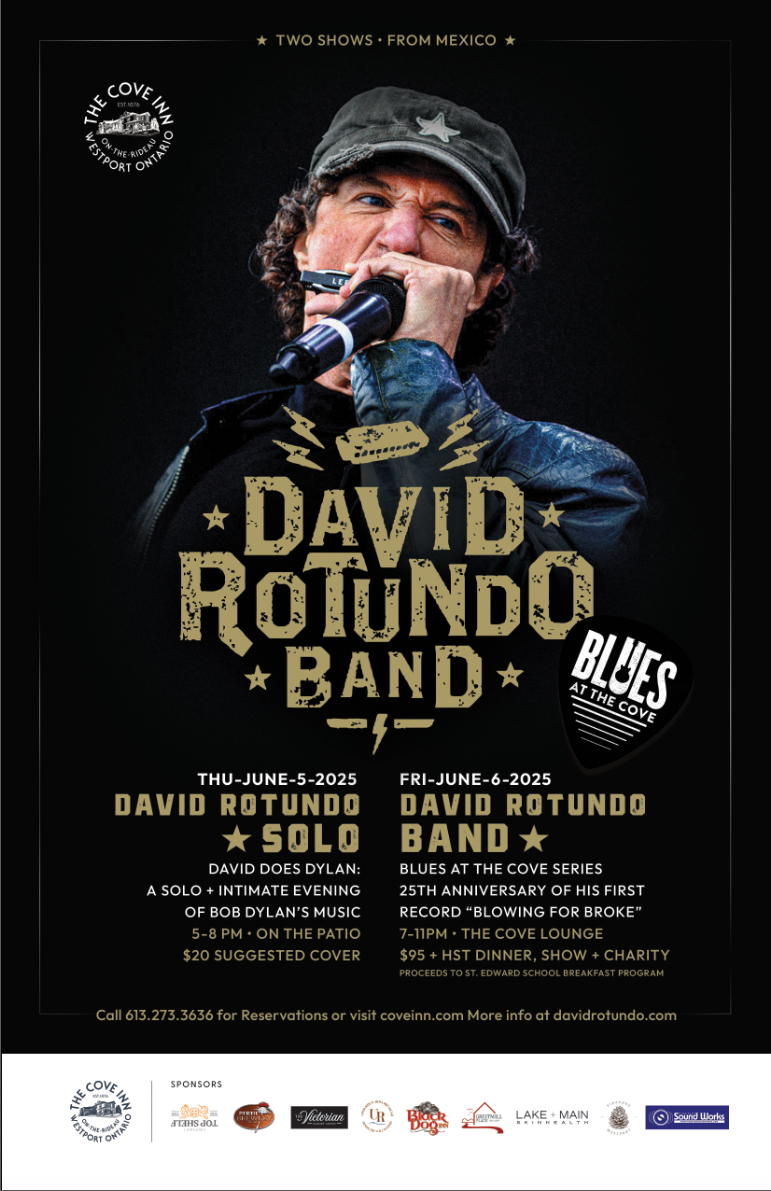 The ever-popular David Rotundo returns to The Cove Inn on Thursday, June 5th, 2025 with a rare and very special solo, intimate performance of the music of Bob Dylan! Also, enjoy a special Blues at The Cove Series show with a delicious dinner, world class music and support for local charity from 7-11pm on Friday, June 6th, 2025 as he and his full band celebrate the 25th anniversary of his record “Blowing for Broke”!
