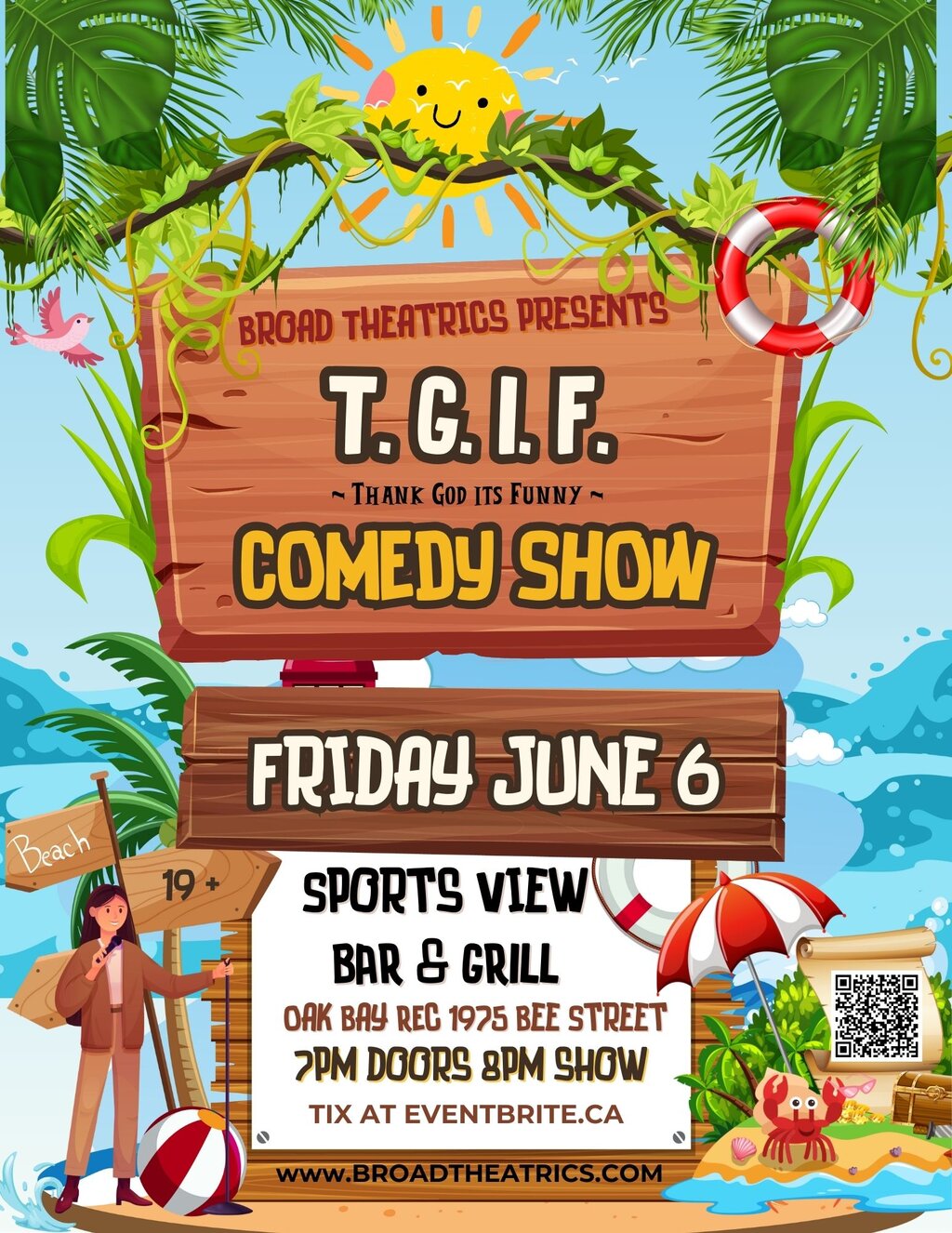 ADVANCE TICKETS are only available thru Eventbrite. All ticketing, group table requests and the Waitlist are managed by Broad Theatrics Entertainment. Please contact Broad Theatrics directly ~ NOT the friendly staff at Oak Bay Recreation.