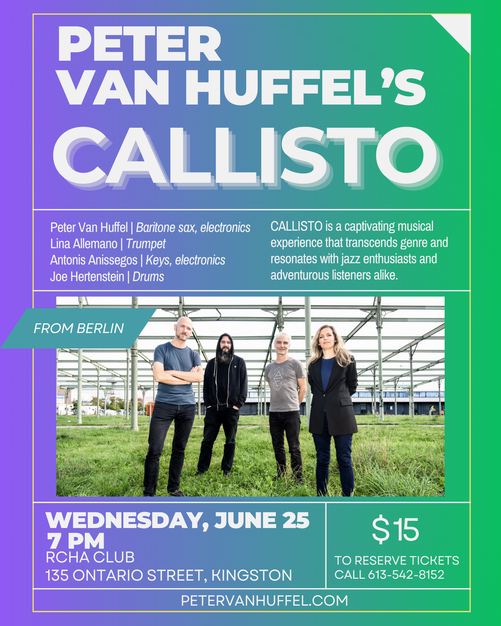 The Berlin-based Kingston-born saxophonist Peter Van Huffel bring his latest project to Canada for an exclusive tour of select festivals and venues across the country. Featuring Peter on baritone saxophone and electronics, Canadian trumpeter Lina Allemano, Greek pianist and electronics artist Antonis Anissegos, and German drummer Joe Herstenstein, CALLISTO is a bass-less quartet that skews the line between composition and improvisation, and which offers a unique and profound approach to modern jazz. Their debut album, “Meandering Demons”, was released in 2024 on Portugal's renowned avant-jazz label, Clean Feed Records.