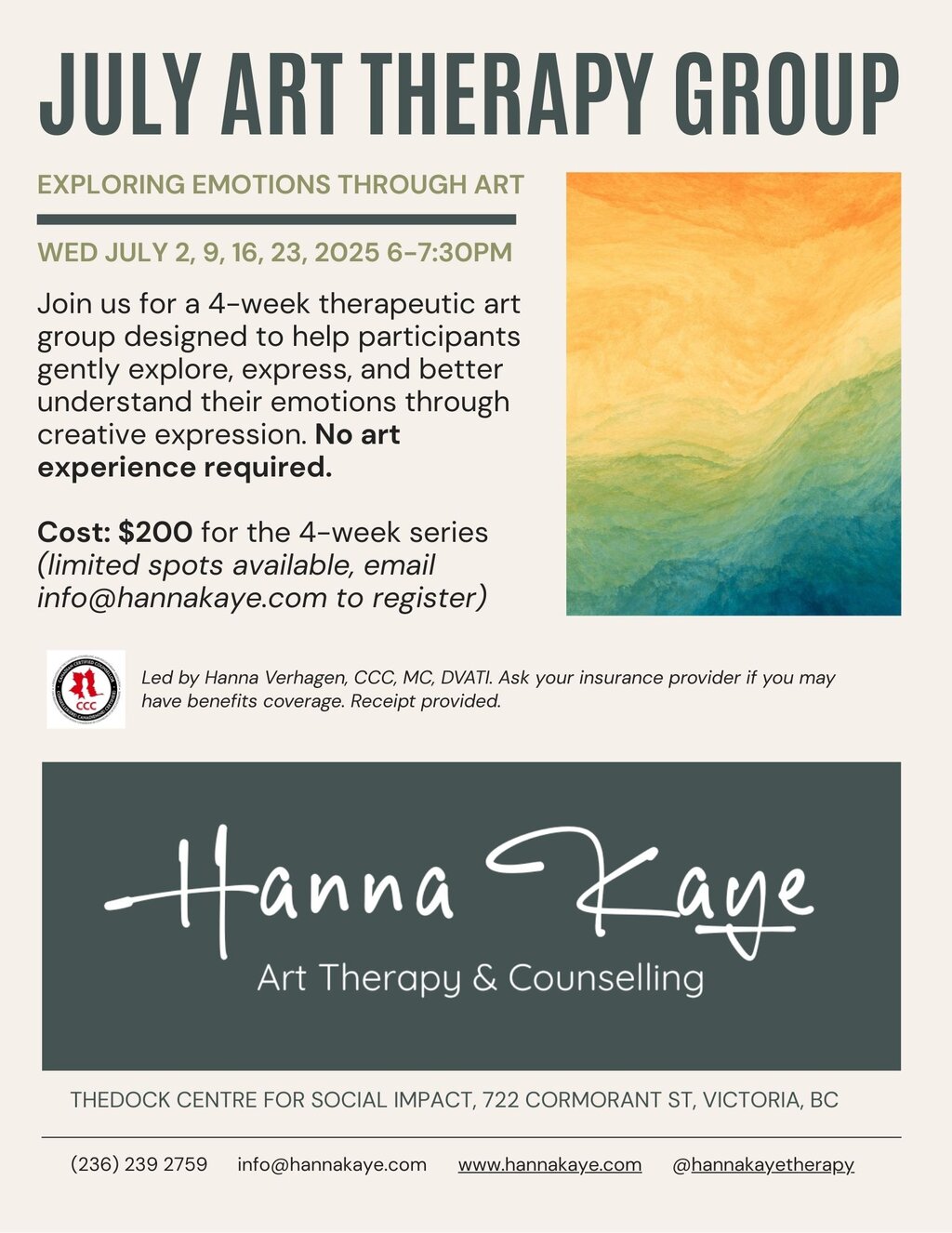 Join us for a unique and enriching experience designed to support emotional wellness through creativity and self-expression. This 4-week group held on Wed Jul 2, 9, 16, & 23 is facilitated by a professional Art Therapist and Canadian Certified Counsellor (CCC) who will guide participants through therapeutic art activities in a safe and supportive environment. Whether you're seeking to learn about your emotions or relieve stress, this series provides a gentle introduction to the creative process. No artistic experience needed.