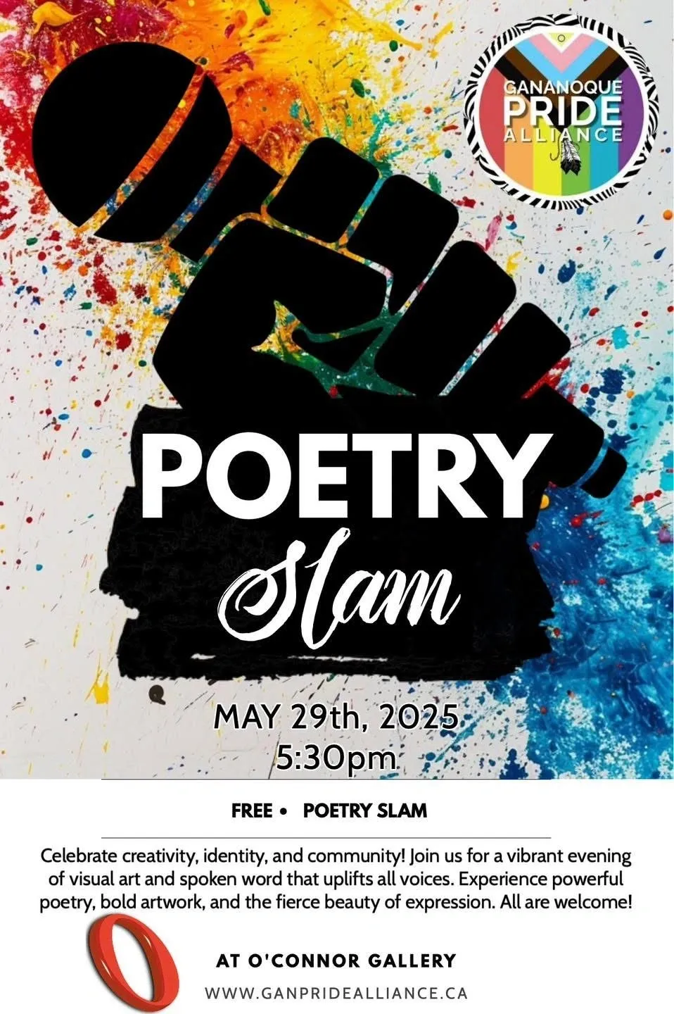 The Gananoque Pride Alliance is thrilled to invite you to our Poetry Slam on Thursday May 29th at 5:30pm at the amazing O’Connor Gallery! A huge THANK YOU to the gallery for sharing their beautiful space with us!