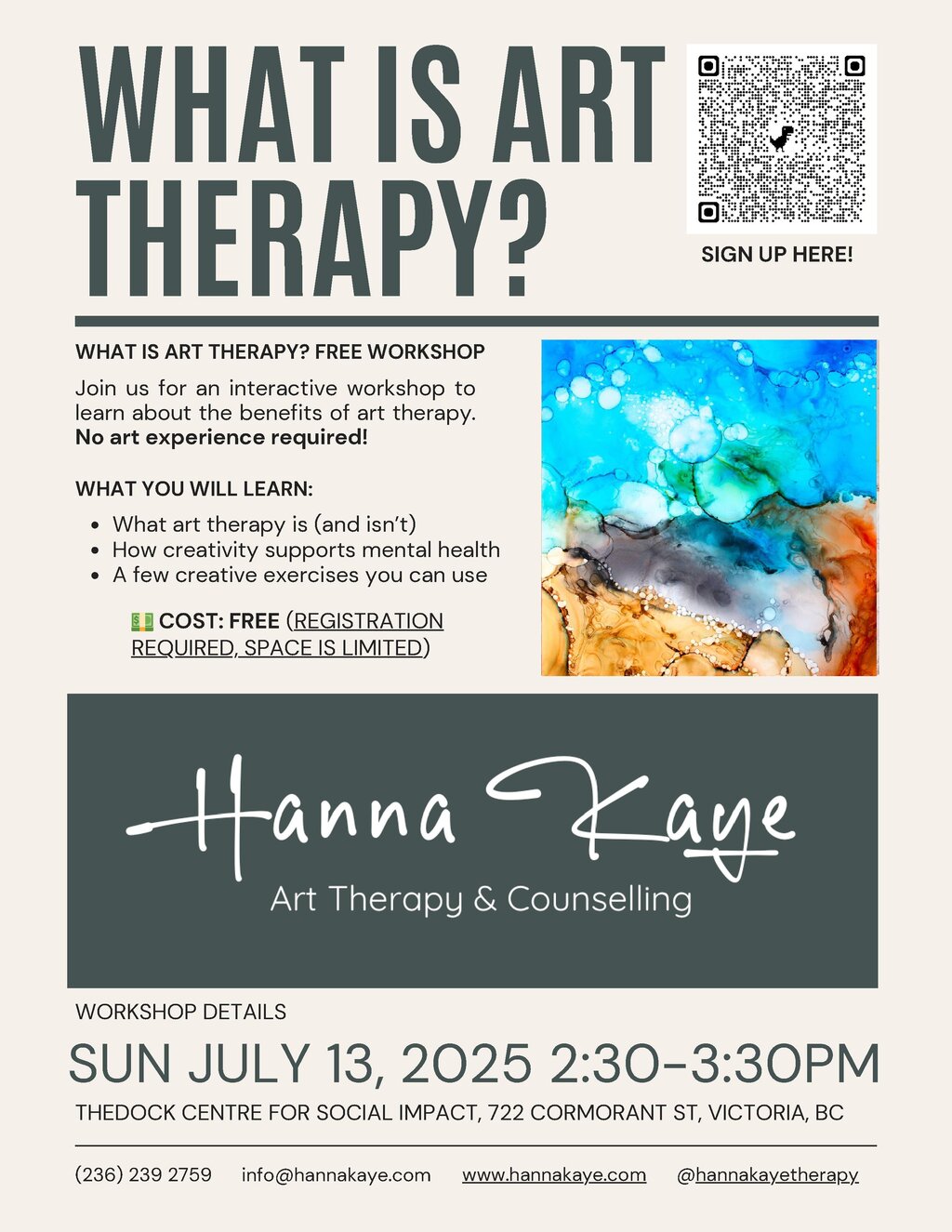 In this complimentary one hour workshop, you'll get a practical, hands-on introduction to what art therapy is and how it works—no art background required. Whether you're looking for personal insight, emotional support, or simply intrigued to learn more about the power of creative expression, this interactive session is the perfect place to start. Facilitated by a professional art therapist and Canadian Certified Counsellor (CCC).
