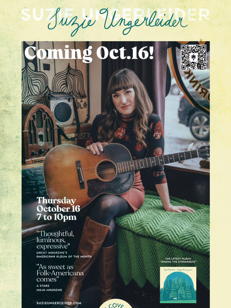 After 23 years away chasing dreams in Toronto, three-time JUNO nominee Suzie Ungerleider (formerly Oh Susanna) returned home to Vancouver, drawn by its salt air and towering trees. Her new album, Among the Evergreens, is a deeply personal journey through time, tracing her path from youthful dreams