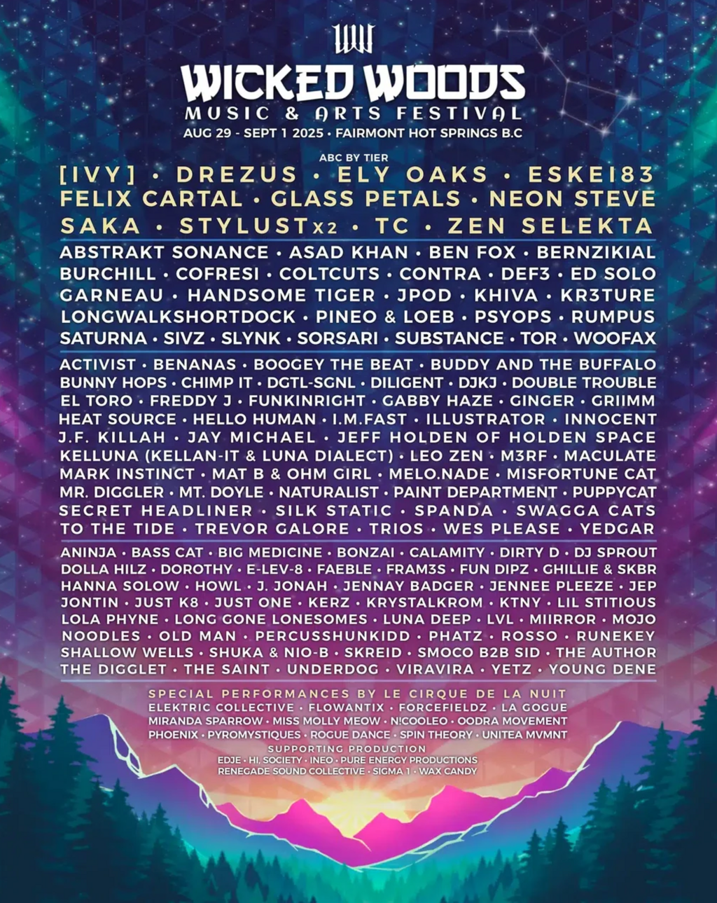 Whether you're returning Wicked Fam, or a curious first-timer, Wicked Woods 2025 promises an unforgettable journey into the pristine setting of Fairmont Hot Springs, BC. Get your tickets, lock in your campsite, and prepare for an intimate and fulfilling festival experience unlike anything else you’ve experienced so far.