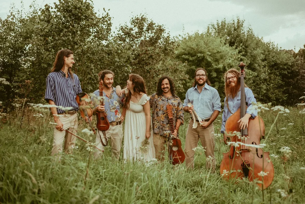 Mexican folk instruments like the jarana, requinto and the tarima (a polyrhythm foot board for traditional rhythmic dancing) blend with microtonal melodies of the east on the violin and oud. All grounded with the earthy touch of an upright bass and an array of masterful percussion including cajon, riqq, pandero, and quijada de burro (donkey jaw bone). Their heavily danceable yet unusual rhythms set the stage for the two singers that never sing a song the same twice. To see El Balcón live is to see a band of best friends. This familial connection comes through on stage where their love of creating and playing together shows in their fiery performances.